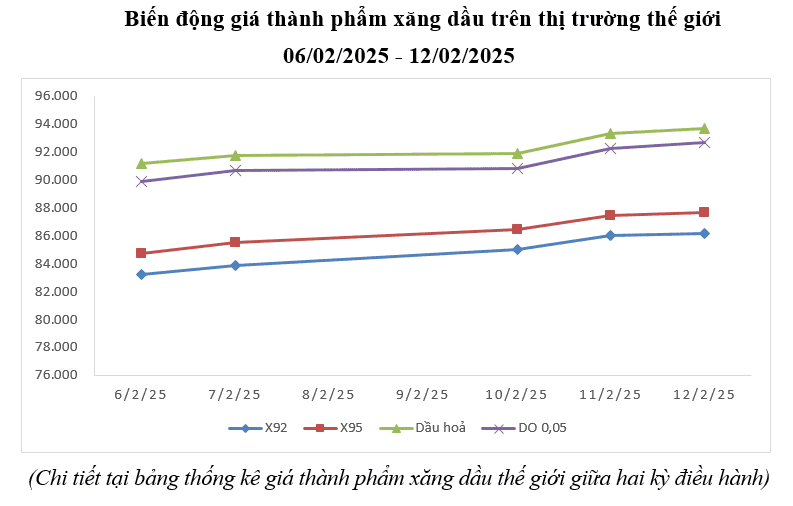 Bình quân giá thành phẩm xăng dầu thế giới giữa kỳ điều hành giá ngày 06/02/2025 và kỳ điều hành ngày 13/02/2025 là: 84,856 USD/thùng xăng RON92 dùng để pha chế xăng E5RON92 (tăng 0,266 USD/thùng, tương đương tăng 0,31%); 86,374 USD/thùng xăng RON95 (tăng 0,147 USD/thùng, tương đương tăng 0,17%); 92,382 USD/thùng dầu hỏa (giảm 0,331 USD/thùng, tương đương giảm 0,36%); 91,282 USD/thùng dầu điêzen 0,05S (giảm 0,555 USD/thùng, tương đương giảm 0,60%); 494,148 USD/tấn dầu mazut 180CST 3,5S (tăng 11,611 USD/tấn, tương đương tăng 2,41%).