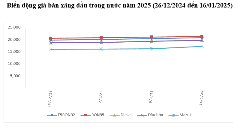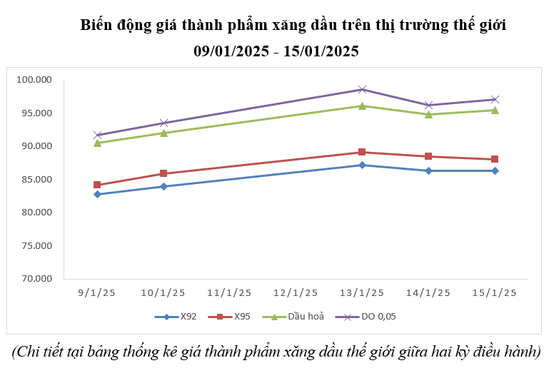 Bình quân giá thành phẩm xăng dầu thế giới giữa kỳ điều hành giá ngày 09/01/2025 và kỳ điều hành ngày 16/01/2025 là: 85,314 USD/thùng xăng RON92 dùng để pha chế xăng E5RON92 (tăng 1,954 USD/thùng, tương đương tăng 2,34%); 87,140 USD/thùng xăng RON95 (tăng 1,148 USD/thùng, tương đương tăng 1,34%); 93,812 USD/thùng dầu hỏa (tăng 3,504 USD/thùng, tương đương tăng 3,88%); 95,424 USD/thùng dầu điêzen 0,05S (tăng 3,209 USD/thùng, tương đương tăng 3,48%); 473,410 USD/tấn dầu mazut 180CST 3,5S (tăng 18,204 USD/tấn, tương đương tăng 4,00%).